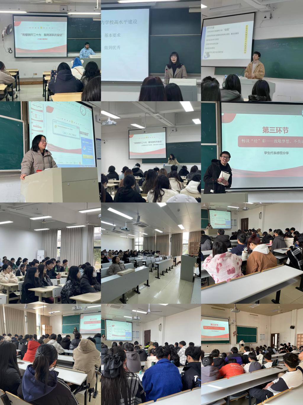 班会共有三环节:青春践行——学风建设、安全教育、奋进之路——学长学姐经验分享、畅谈“经”彩——致敬梦想、不负远方。