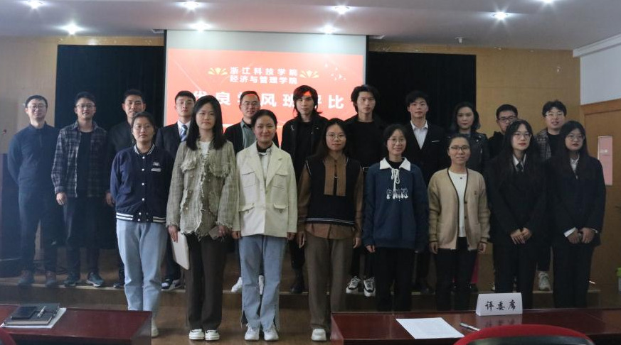 12个参评班级按照抽签依次上台,通过丰富的图文从班级学习和学风情况、社会实践和文体活动参与度、志愿服务参加情况等方面做了全面展示,各班向评委们展示了班级的班风班貌和特色班风建设经验。最终,结合参赛申报班级材料及现场展示环节评比,按照总得分,公司择优推荐财务管理203、财务管理201、经济学(中美班)201为“校级特优学风班”,金融工程201、财务管理202、国际商务(中澳班)211、经济学201、财务管理213、经济学(中美班)202、金融工程211为“校级优良学风班”。