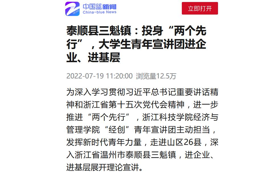 特色活动 首页 员工工作 特色活动 正文 中国蓝新闻客户端、今日泰顺新闻客户端等媒体关注公司“经创”青年宣讲团 近日,我公司“经创”青年宣讲团走进山区26县,深入浙江省温州市泰顺县三魁镇,进企业、进基层,围绕省第十五次党代会精神展开宣讲,重点讲述“两个先行”、“8个经验”、“5大战略指引”、“11方面重要遵循”等内容。宣讲团受到中国蓝新闻客户端、今日泰顺新闻客户端等媒体关注。 中国蓝新闻客户端:泰顺县三魁镇:投身“两个先行”,老员工青年宣讲团进企业、进基层 今日泰顺新闻客户端:省第十五次党代会精神进企业|宣讲鼓劲促发展 企业聚力助共富