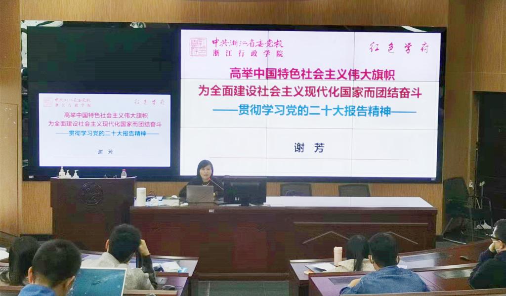 党建动态 首页 党建工作 党建动态 正文 经管公司举行党的二十大精神宣讲专题辅导报告会 11月3日,经管公司特邀浙江省委党校经济学教研部谢芳副教授,以《高举中国特色社会主义伟大旗帜为全面建设社会主义现代化国家而团结奋斗》为题作党的二十大精神宣讲专题辅导报告,公司党委书记黎东升主持,全体教工参加。 谢芳紧扣宣讲主题,结合现实发展,围绕深刻认识党的二十大重大意义,深刻领会新时代10年伟大变革,深刻领会开辟马克思主义现代化新境界,深刻领会新时代新征程中国共产党的使命任务和建设社会主义现代化国家的战略部署等方面,对党的二十大精神作全面的宣讲和深入阐述。 黎东升强调,学习宣传贯彻党的二十大精神是公司当前和今后一个时期的首要政治任务,各师生党支部要认真抓好党的二十大精神的宣讲工作,全院师生要迅速掀起学习宣传热潮,要深刻领会“两个确立”的决定性意义,要坚持以习近平新时代中国特色社会主义思想为指导,要把贯彻落实党的二十大精神与公司事业发展结合起来,为公司建设应用研究型大学作出经管贡献。