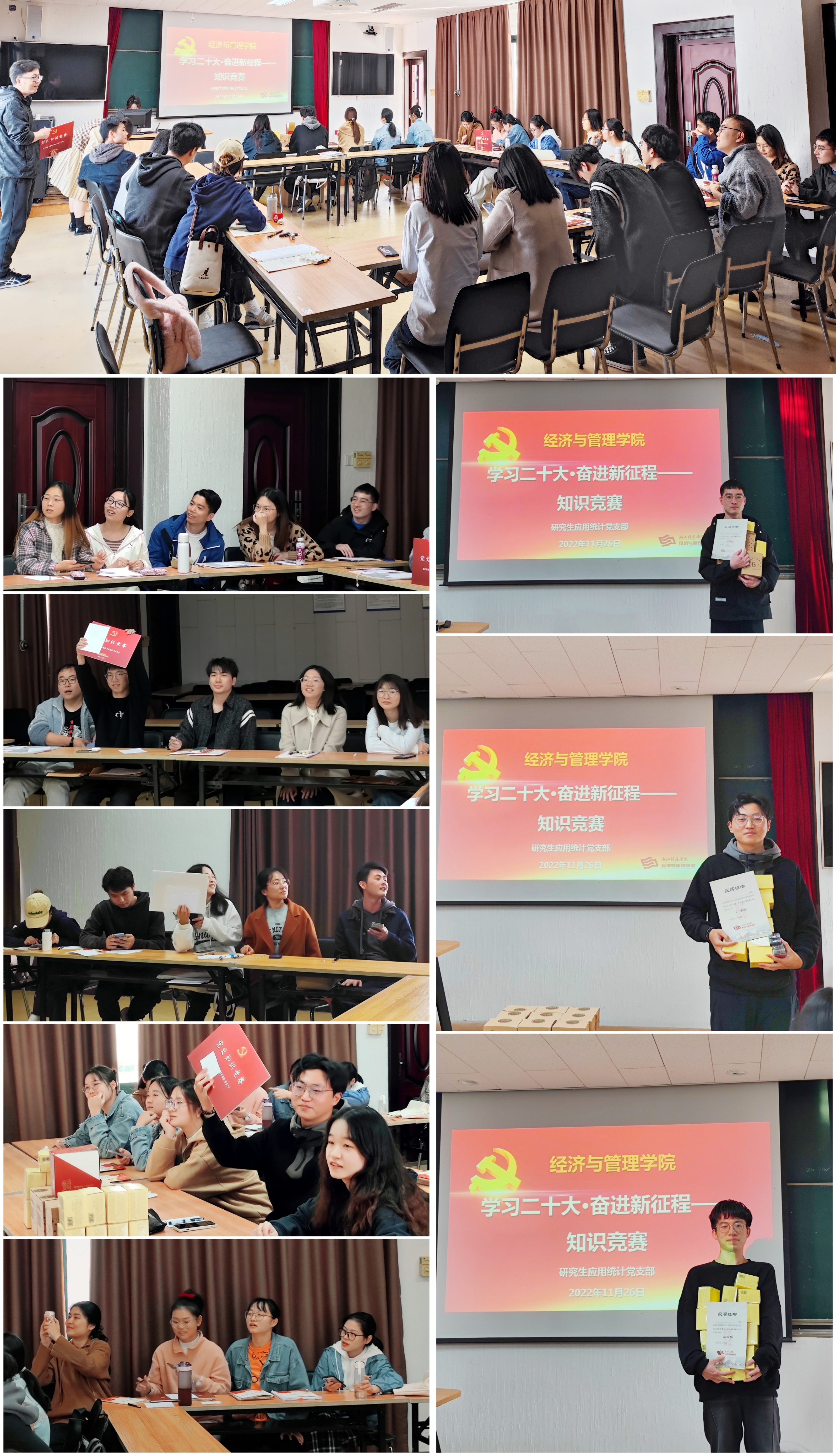 为深入学习贯彻党的二十大精神“踔厉奋发踏新程,勇毅前行谱新篇”,提高支部全体党员思想政治水平,研究生应用统计党支部于2022年11月26日在精艺园B3-422举行“学习党的二十大,奋进新征程”知识竞赛。竞赛题目来自《中共党史》、《新中国史》、《改革开放史》、《社会主义发展史》、新版《中国共产党章程》、《中国共产党支部工作条例(试行)》和党的二十大报告。