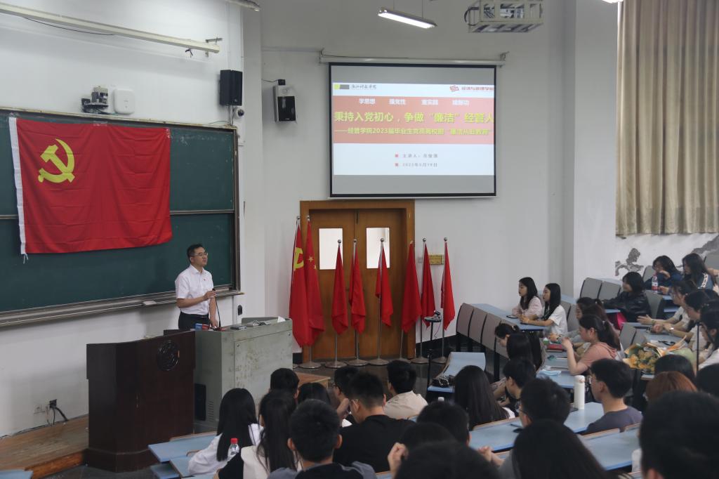 党建动态 首页 党建工作 党建动态 正文 【主题教育】经管公司开展廉洁教育系列活动 为深入学习宣传贯彻党的二十大精神,认真落实党中央《关于加强新时代廉洁文化建设的意见》,经管公司开展廉洁教育系列活动。 5月19日,经管公司党委副书记、纪委书记范俊强以“秉持入党初心,争做“廉洁”经管人”为题,为150名2023届毕业生党员做离校前“廉洁从业教育”。 5月26日,公司纪委开展纪检监察干部“圆桌会”学习沙龙暨主题教育学习会,学习纪检监察工作的相关文件,并讨论编写《中共浙江科技公司经济与yl永利集团官网登录纪委纪检监察工作文件汇编》和《浙江科技公司经济与yl永利集团官网登录反腐倡廉工作量表》,加强师生的廉洁教育。 5月26日,与蚂蚁集团联合开展金融知识进校园活动,争做金融“明白人”,筑牢经管人廉洁价值观。 6月初,公司以党支部为单位,下发公司纪委编制的《反腐倡廉工作量表》,并回收评阅存档,提高师生廉洁教育的针对性。 6月9日,公司领导班子成员赴廉洁文化教育基地-余杭“四无粮仓”陈列馆现场学习,进一步强化党性修养,加强廉洁自律意识,推动廉洁建设走深走实。 x