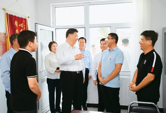 2019年7月15日至16日,中共中央总书记、国家主席、中央军委主席习近平在内蒙古考察并指导开展“不忘初心、牢记使命”主题教育。这是15日下午,习近平在赤峰市喀喇沁旗河南街道马鞍山村党群服务中心了解基层党建、民族团结和乡村振兴情况。 新华社记者 谢环驰/摄