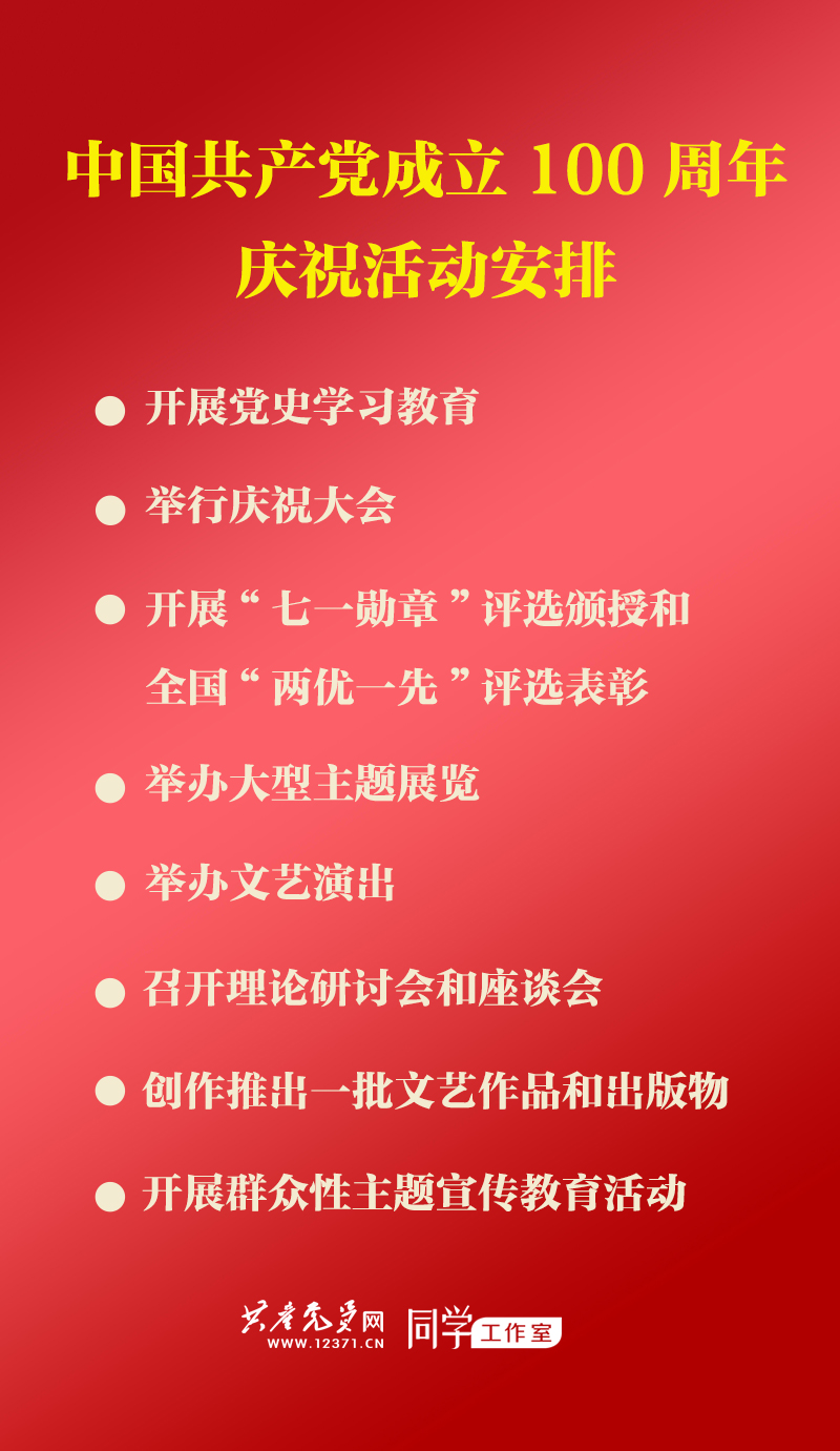 六是召开理论研讨会和座谈会。中央宣传部将会同中央组织部、中央党校(国家行政公司)、中央党史和文献研究院、教育部、中国社会科公司、军委政治工作部联合召开庆祝建党100周年理论研讨会;中央组织部将召开全国优秀共产党员、优秀党务工作者、先进基层党组织代表庆祝建党100周年座谈会,还要召开老党员老干部座谈会和党的建设历史经验研讨会;中央统战部将商各民主党派中央、无党派人士和全国工商联,召开各界人士庆祝中国共产党成立100周年座谈会。