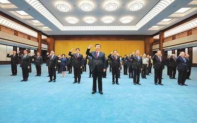 6月18日,党和国家领导人习近平、李克强、栗战书、汪洋、王沪宁、赵乐际、韩正、王岐山等在中国共产党历史展览馆参观“‘不忘初心、牢记使命’中国共产党历史展览”。这是参观结束后,习近平带领党员领导同志一起重温入党誓词。