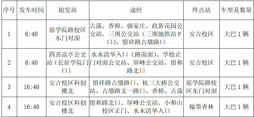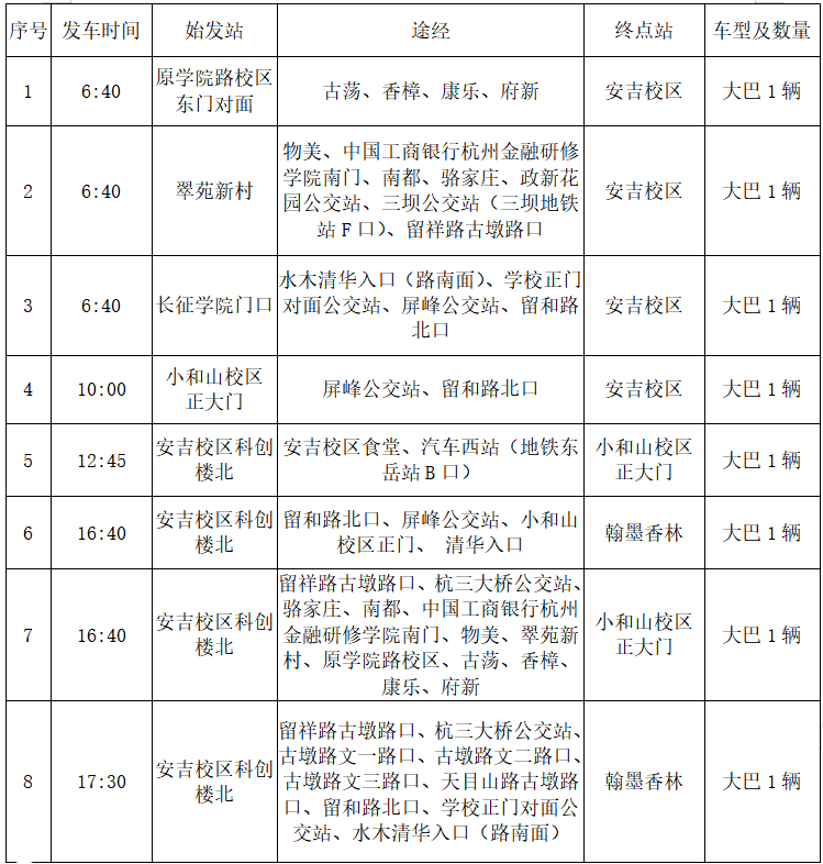 公司通知 首页 通知公告 公司通知 正文 转发:关于2025年迎新、军训期间教职工班车安排的通知(安吉校区) 时间:2025-09-11 阅读次数: 各公司(部)、机关各部门、教辅单位: 根据公司迎新、军训期间工作安排,安吉校区教职工班车做相应调整,望相互告知。 一、迎新期间(9月8日-9月15日)班车安排如下: 二、军训期间(9月16日-9月30日)班车安排如下: 注:周末期间(9月20日-21日、9月27日)按周末班车安排运行;9月22日-30日另增加一趟8:30小和山校区发车、21:10安吉校区返回班车。 如有不明之处请联系:13958178960(车队廖师傅)、0572-5661388(安吉后勤陈老师) 安吉校区公共事务中心 2025年9月8日