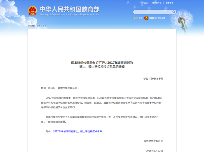 近日,国务院学位委员会发布《关于下达2017年审核增列的博士、硕士学位授权点名单的通知》(学位〔2018〕9号),公司获批“国际商务”、“应用统计”2个硕士专业学位授权点。其中,“国际商务”硕士点拟设国际商务环境与风险、国际工程技术创新管理、食品安全与国际贸易、国际工程商务投融资决策等4个研究方向;“应用统计”硕士点拟设管理统计、金融统计、经济社会统计等研究方向。