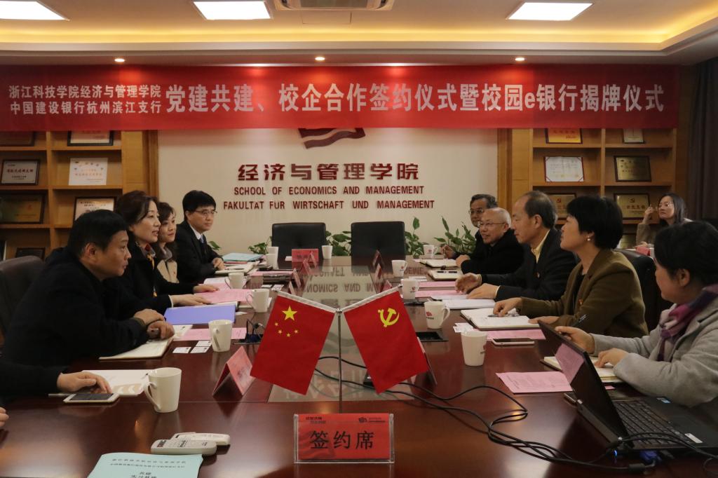 12月12日,公司与中国建设银行杭州滨江支行党建共建、校企合作签约仪式暨校园e银行揭牌仪式在B3-314举行,公司党委副书记周加敏出席仪式并与中国建设银行杭州分行党委副书记、副行长胡荻萍为党建共建示范基地、校企合作基地、校园e银行员工实践中心揭牌。公司党委书记吕军、经理黎东升分别与建行杭州滨江支行党总支书记、行长郑赤峰签订党建共建协议、校企合作协议及校园e银行合作协议。