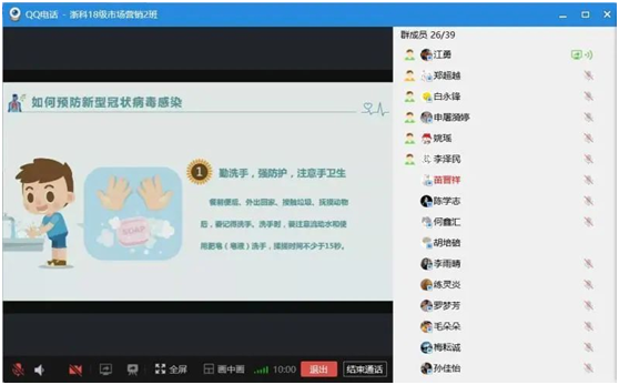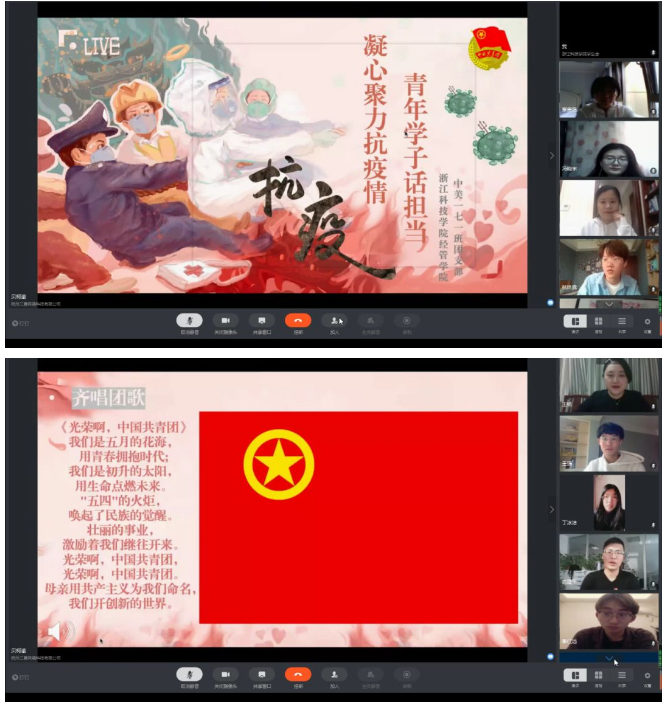 为认真学习贯彻习近平总书记在统筹推进新冠肺炎疫情防控和经济社会发展工作部署会议上的重要讲话精神,结合当前“停课不停学”网课学习安排,3月11日下午,在校团委的组织和指导下,公司经济学(中美班)171团支部通过网络开展“抗疫情、话担当”主题特别主题团日活动,共同学习、分享交流、弘扬青春正能量,勇担使命,共克时艰。浙江省青联副秘书长宋元菁,浙江科技公司团委书记李俊,经管公司党委副书记王杨,浙江科技公司团委副书记俞建平,经管公司团委书记张东参加了本次线上特别主题团日活动,共话疫情之下教师的育人使命和浙科学子的责任担当。“作为在校老员工,我们更应珍惜光阴,将‘停课不停学、学习不延期’,努力学习作为自己最大的责任与使命,积蓄起为国分忧、为民担当的智慧和力量。”冯晓宇同学说道。在主题团日活动中,同学们认真学习习近平总书记在统筹推进新冠肺炎疫情防控和经济社会发展工作部署会议重要讲话精神和习近平总书记给西藏大学医公司员工的回信精神,围绕公司党委书记龚建立教授2020年春季学期“开学第一课”开展讨论,发表感悟,抓好团员青年疫情防控期间的思想政治引领。活动中,返乡参与志愿服务的同学还与大家分享了自己志愿服务感悟。