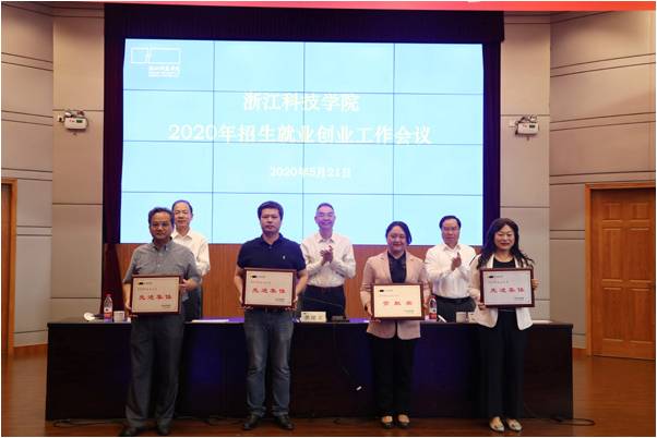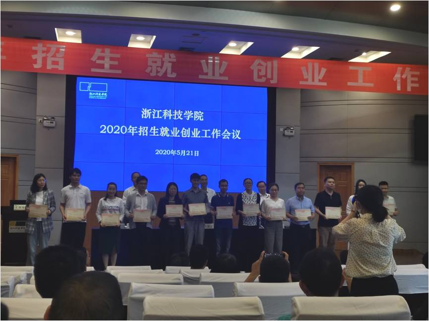 公司党委副书记周加敏宣读《浙江科技公司关于表彰2019年毕业生就业工作先进集体和先进个人的通报》。校领导为获表彰的集体和个人代表颁奖。公司荣获2019年校就业工作“先进集体”荣誉称号及“就业贡献奖”;张华勇、叶俊焘、程芳芳、徐晓秋、彭鸿广、荣珏、汪祥富、李月宁等8名教师被评为校就业工作先进个人。