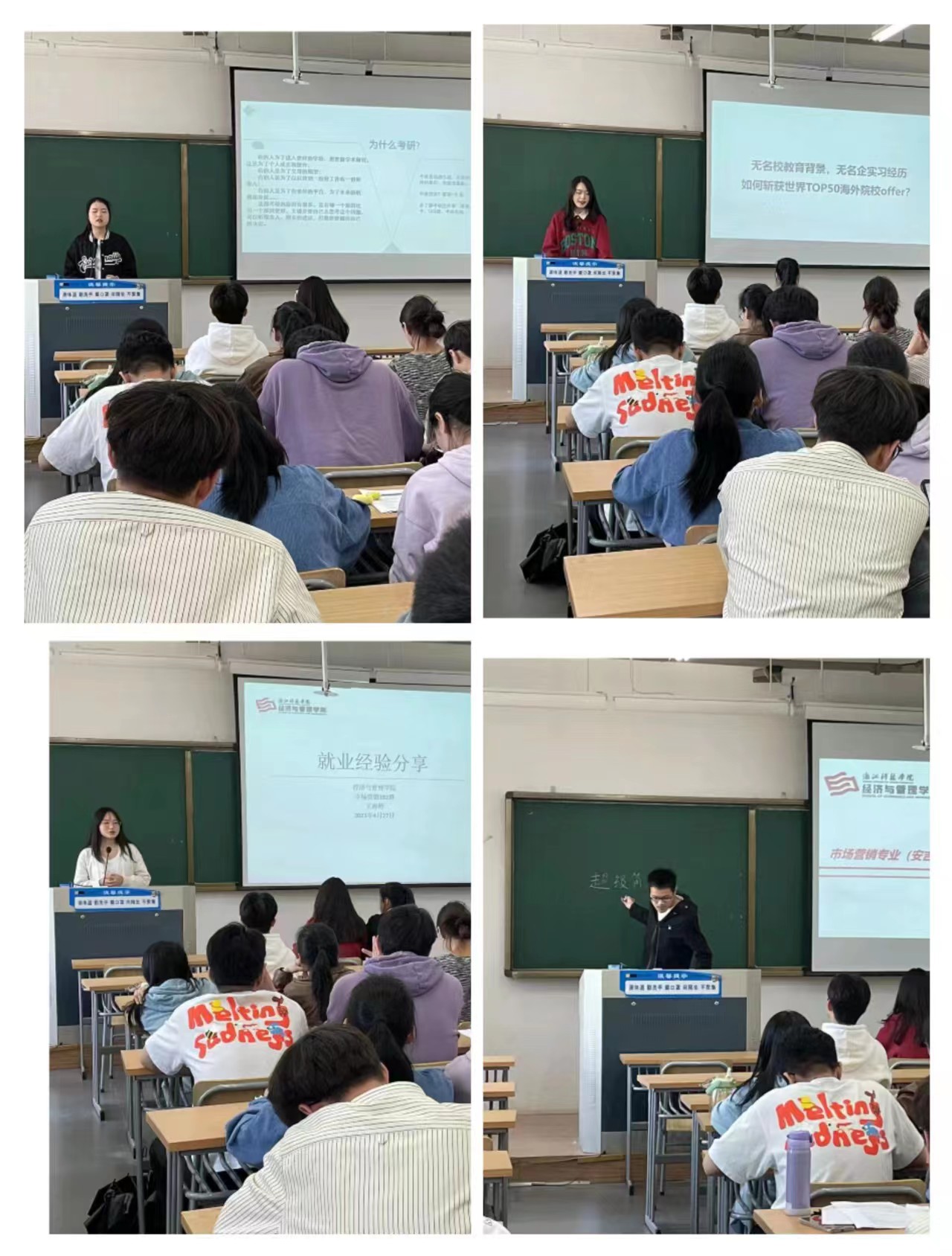 4月27日,经管公司“经”彩上岸辅导员工作室负责人李寒滇老师携19级员工邵伊祺、刘雯洁、王雨婷、张恒彬至安吉校区开展市场营销(专升本)专业就业、升学交流会。