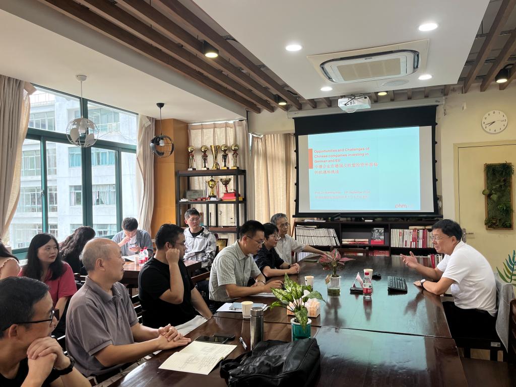 yl永利集团官网登录新闻 首页 yl永利集团官网登录新闻 正文 德国纽伦堡应用科学大学企业管理系Naiming Wei教授来访经管公司并开展学术讲座与交流 时间:2024-09-20 阅读次数: 2024年9月19日,德国纽伦堡应用科学大学企业管理系Naiming Wei(韦乃铭)教授来访公司开展中德产业经济国别研究的学术交流,并为经管公司师生作了题为“中资企业在德国/欧盟投资面临的机遇和挑战”的学术报告。Wei 教授通过亲身的经历与详实的数据与实例,从中德经济贸易关系发展的概况与过程、中国企业在德国与欧盟国家的投资并购发展及其影响、以及中国企业在德投资的案例等方面,对中国企业在德国以及欧盟开展国际化投资经营所遇到的机会与风险进行了分析与介绍。 经管公司部分师生积极参加了讲座,并就中国企业近年来在德国开展并购投资活动面临的问题与机遇等问题与Wei教授进行了探讨。会后,董颖、关高峰、赵之奇、南仲信等老师与Wei教授就加强双方今后的学术交流与合作事宜进行了洽谈,双方将加强在中德产业经济国别研究方面的合作,为师生提供更多的交流机会。