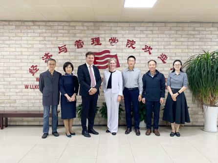 在与来访的埃尔福特应用科学大学运输经济学教授Florian Michael Heinitz和工商管理系教授Sabine Sigrid Brunner的会谈中,双方一致同意将于2025年重启物流管理专业中德2+3联合培养的合作项目,德方同时表示希望未来将双方的2+3联合培养合作扩大到经济与工商管理专业,并希望在应用型人才培养与企业社会服务方面加强与公司的合作。